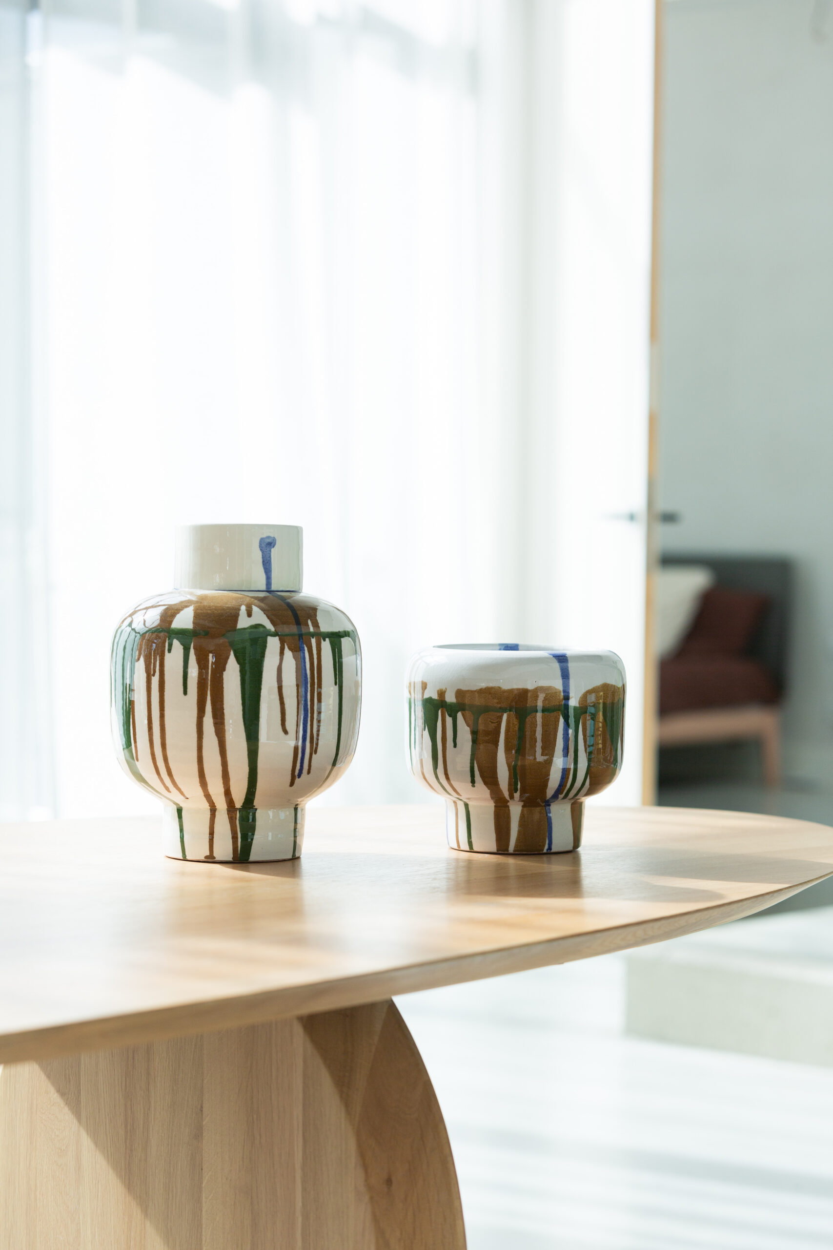 The El Dorado series features handmade stoneware planters crafted in Portugal, finished with expressive, hand-applied glaze patterns. Each piece is unique, with natural variations in color and flow that highlight its artisanal character.