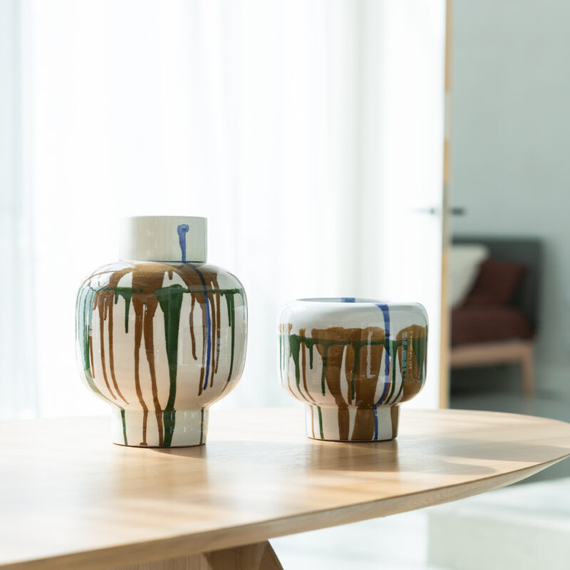 The El Dorado series features handmade stoneware planters crafted in Portugal, finished with expressive, hand-applied glaze patterns. Each piece is unique, with natural variations in color and flow that highlight its artisanal character.